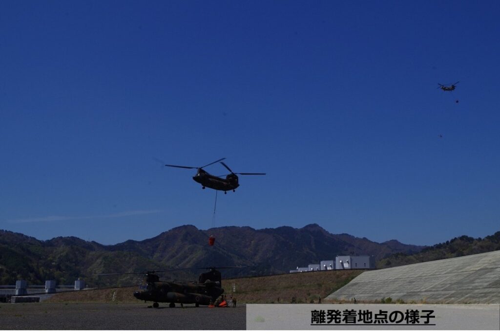 陸上自衛隊の「UH-1」ヘリコプターは、空中消火を行う機体の統制を担い、事故防止や円滑な運用を支えています。