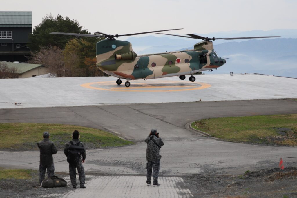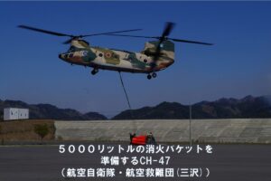 CH-47は大容量の水を運搬できる大型ヘリで、災害派遣において重要な役割を担っています。